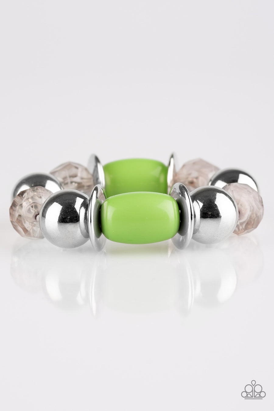 Dramatic silver, refreshing green, and faceted cloudy beads are threaded along a stretchy elastic band, creating a seasonal look around the wrist.