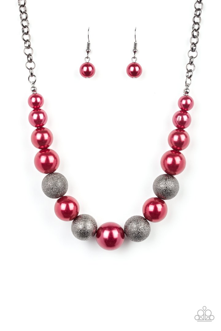 Dusted in glitter, sparkling gunmetal and pearly red beads are threaded along an invisible wire below the collar for a glamorous look. Features an adjustable clasp closure. Sold as one individual necklace. Includes one pair of matching earrings.