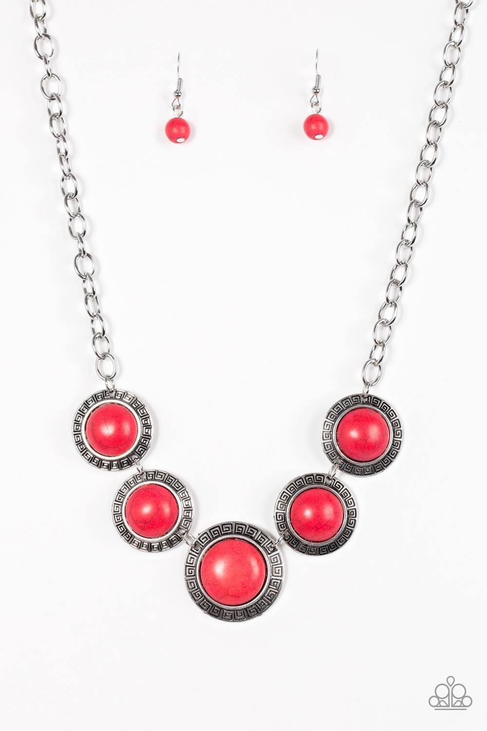 Chiseled into tranquil circles, smooth red stones are pressed into ornate silver frames and linked below the collar for a tribal inspired look. Features an adjustable clasp closure.