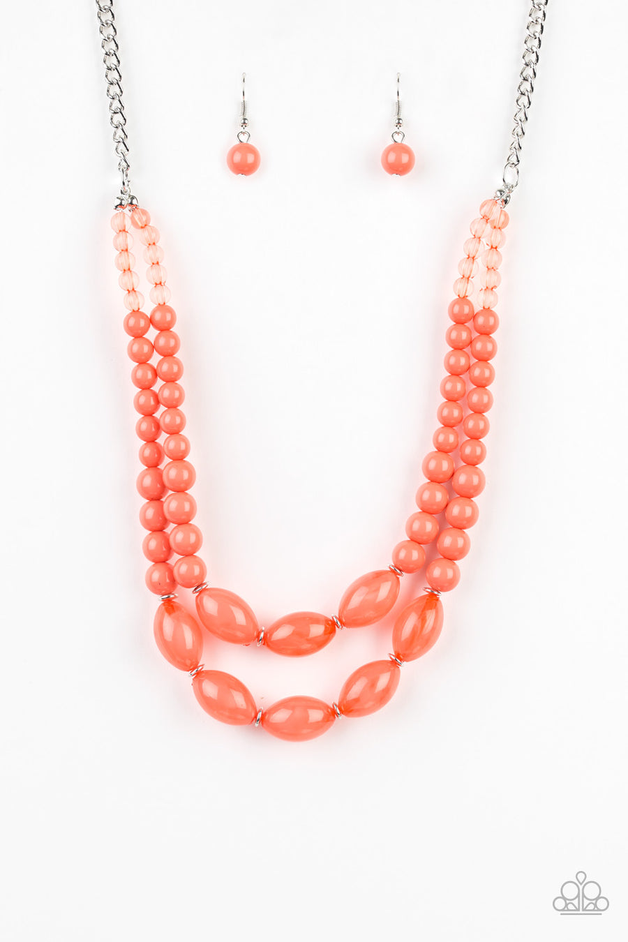 A collection of glassy, polished, and cloudy Living Coral beads are threaded along two invisible wires below the collar for a beautiful pop of color. Features an adjustable clasp closure.