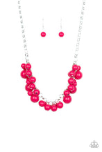A collection of bubbly pink beads swings from the bottom of a shimmery silver chain, creating a vivacious fringe below the collar. Features an adjustable clasp closure. Sold as one individual necklace. Includes one pair of matching earrings.